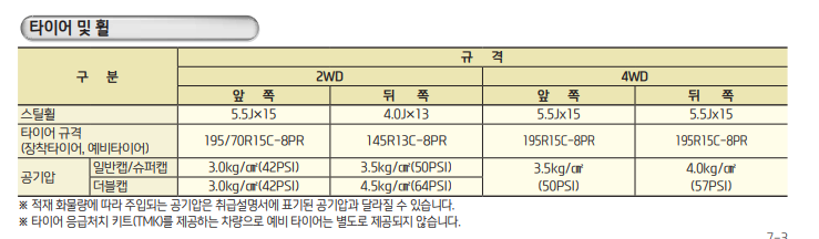 이번에 스노우로전륜205 70 r15 타이어 공기압 포터2얼마를 넣어야하나요?약1.5톤~2톤 정도 싣고 다녀요.1톤 포터2입니다.